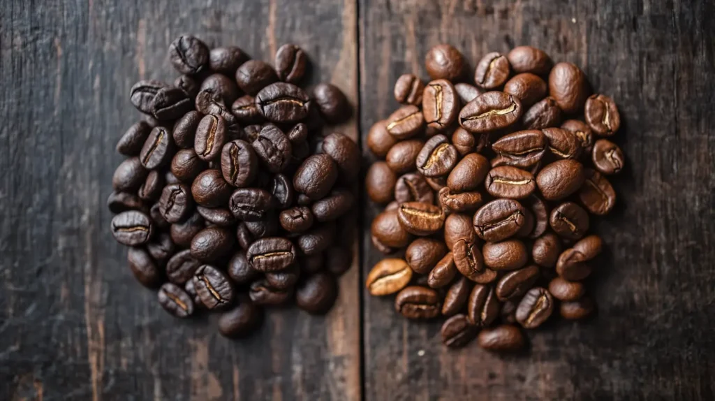- Тёмная обжарка (French, Italian). Длительная обжарка при высоких температурах. Она выводит на поверхность зёрен масла, делая их блестящими. Вкус становится насыщенным, с нотами жжёной карамели, дыма и тёмного шоколада, а сортовая кислотность практически полностью исчезает. Часто используется для классических эспрессо-смесей, чтобы добиться мощного, густого вкуса, который отлично сочетается с молоком.