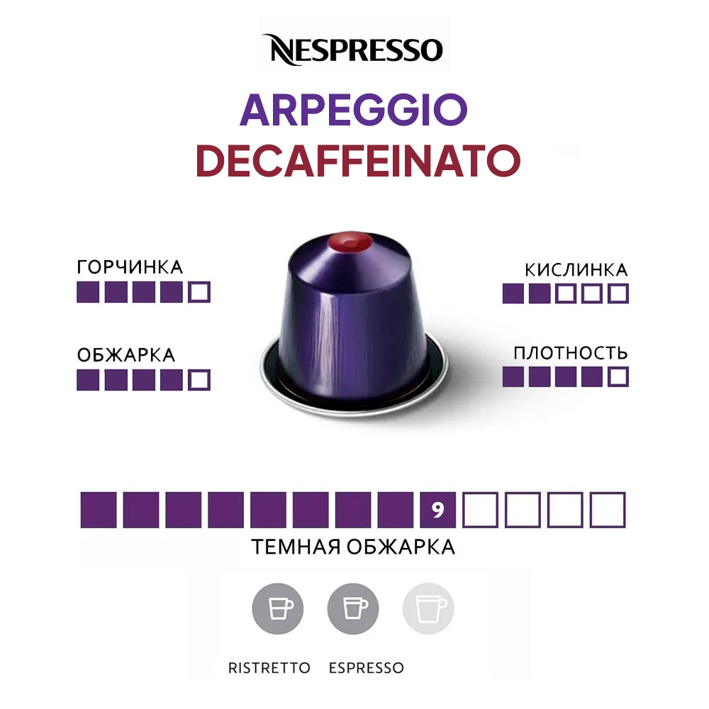 Кофе в капсулах Nespresso Ispirazione Firenze Arpeggio Decaffeinato — густой и сливочный вкус с яркими нотками какао и темной обжарки. Его кремовая, бархатистая текстура делает его неотразимым.