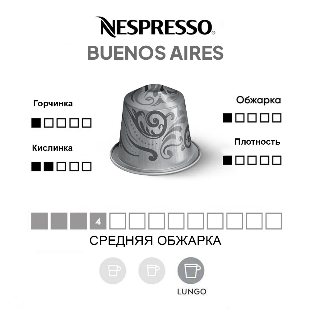 Капсулы Nespresso Original Buenos Aires Lungo — благодаря светлой обжарке и сладком вкусу  бленда Nespresso Bueno, Вы насладитесь кофе как настоящий житель Буэнос-Айреса — медленно выпейте свой Lungo за чтением ежедневной газеты или в компании друзей и коллег. В оживленном Буэнос-Айресе чувствуется энергия города, но Вы всегда можете уединиться с чашкой согревающего кофе. Заварите этот мягкий Lungo в чашке, предварительно наполнив ее горячим молоком, и не бойтесь добавить тростниковый сахар, чтобы подсластить вкус кофе. Кофе в капсулах Nespresso Buenos Aires Lungo — сочетает в себе слегка обжаренную колумбийскую арабику с угандийской робустой, придавая отчетливые зерновые нотки и сладкий попкорн.