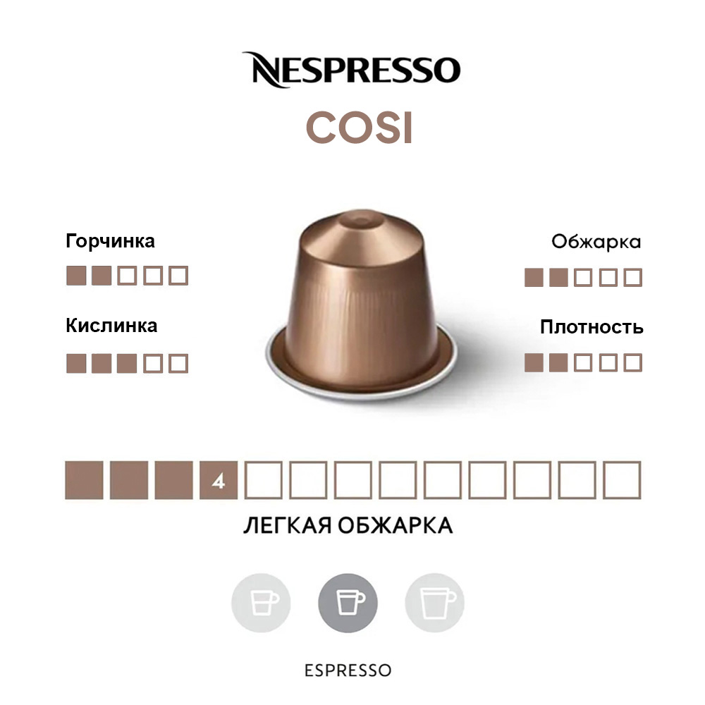 Капсулы Nespresso Original Cosi — благодаря сортам слегка обжаренной арабики из Восточной Африки, Центральной и Южной Америки, Cosi является легким эспрессо с освежающими цитрусовыми нотками. Сочетание самых изысканных сортов арабики из Восточной Африки придает этому сорту характерную цитрусовую нотку, которая гармонично дополняется легким и сладким вкусом арабики из Центральной и Южной Америки. Зерна из Кении придает этому бленду ноты спелых красных фруктов, а база из Коста-Рики – ноты сладких злаков. Грубый помол придают этому эспрессо мягкий и насыщенный вкус.  Легкая обжарка подчеркивает тонкие фруктовые нотки сорта Cosi. Кофе в капсулах Cosi с молоком приобретает шелковистую текстуру и нотки сладкого печенья.