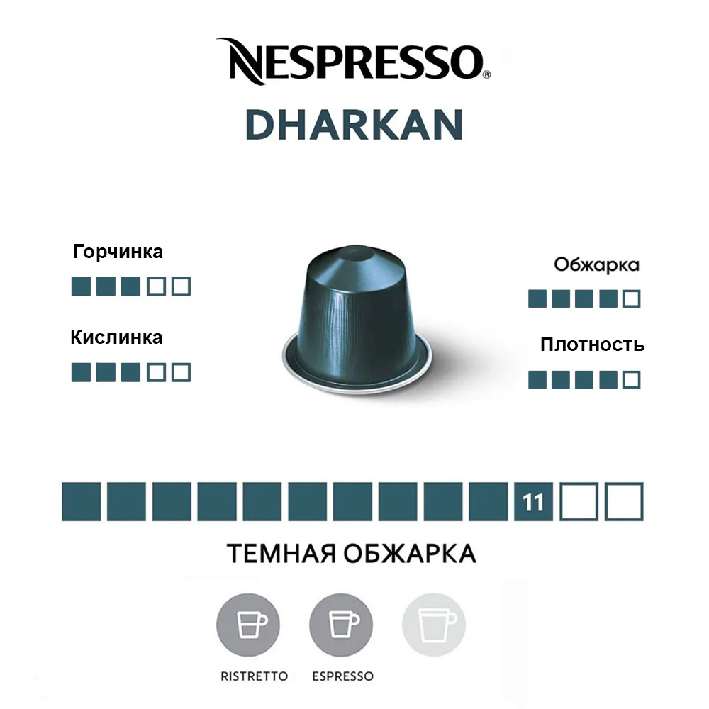 Капсулы Nespresso Original Dharkan — классика от Nespresso, гармония нежного, бархатистого вкуса и интенсивности бленда Dharkan создана благодаря превосходному сочетанию арабики из Латинской Америки и Азии (регион Коста-Рика, Индонезия, о. Ява). Dharkan характеризуется жареным, горьковатым вкусом какао и бархатистой текстурой. Благодаря технологии длительной обжарки при низкой температуре этот превосходный бленд арабики раскрывается изысканным ароматом. Ярко выраженный вкус с древесными, злаковыми и нотами горького какао идеально сочетается с нежной бархатистой текстурой.
