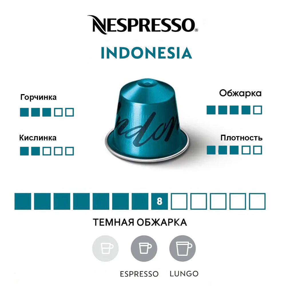 Капсулы Nespresso Original Master of Origin Indonesia — кофе сорта Арабика, созданный Индонезийскими фермерами на острове Суматра с использованием традиционного местного способа влажной обработки. Именно уникальный метод выращивания кофе придает этому классическому кофе в капсулах из Индонезии полноту и бархатистость. Экзотический кофе с насыщенным ароматом сушеных табачных листьев и тропических деревьев. Благодаря удалению пергаментной оболочки, пока зерно еще не высушено, кофе обретает бархатистую текстуру