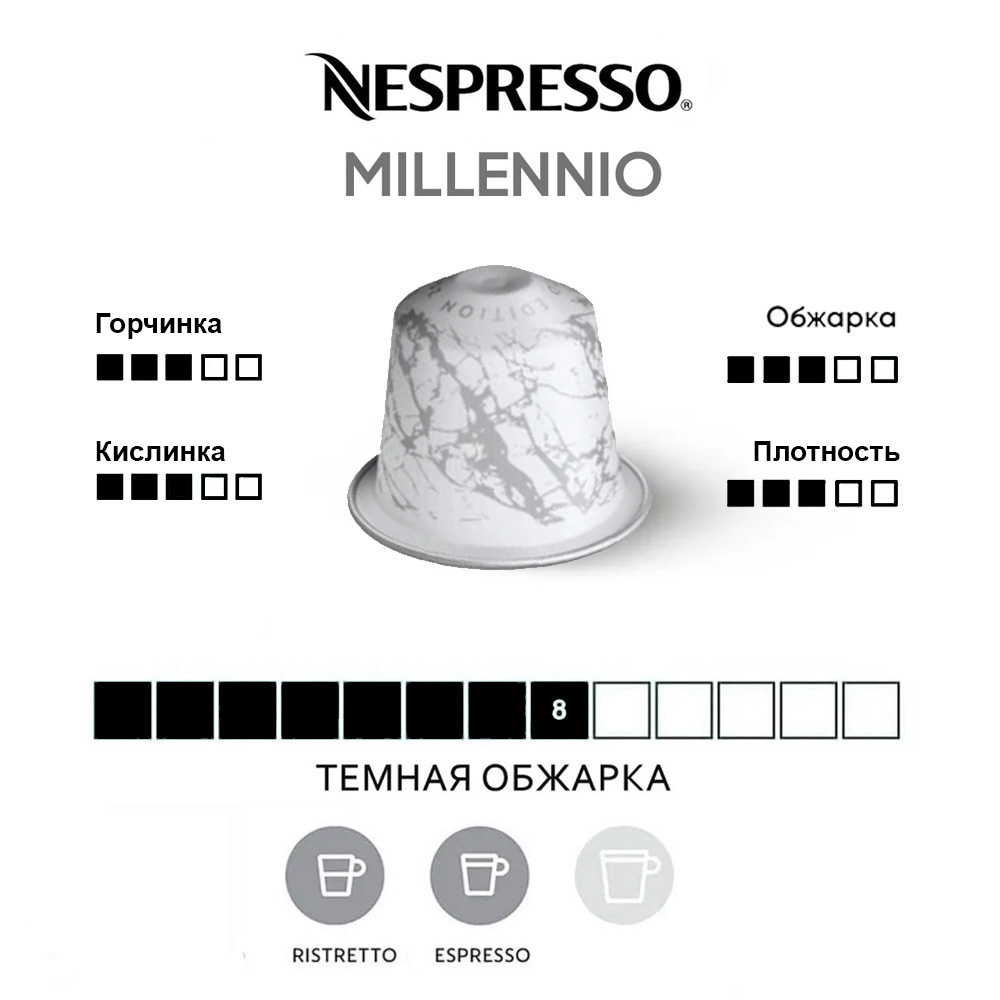 Капсулы Nespresso Original Ispirazione Millennio — арабика из Бразилии и Колумбии легкой и короткой обжарки сочетается с кофе с субконтинента Индии, создавая свежий, современный вкус. Кофе в капсулах Nespresso Ispirazione Millennio обжаривается по технологии разделенной обжарки. Арабика из Индии обжаривается отдельно, темная и короткая обжарка, в то время как зерна других сортов обжариваются вместе при несколько более низкой температуре, короткая обжарка — чтобы сохранить фруктовые нотки.
