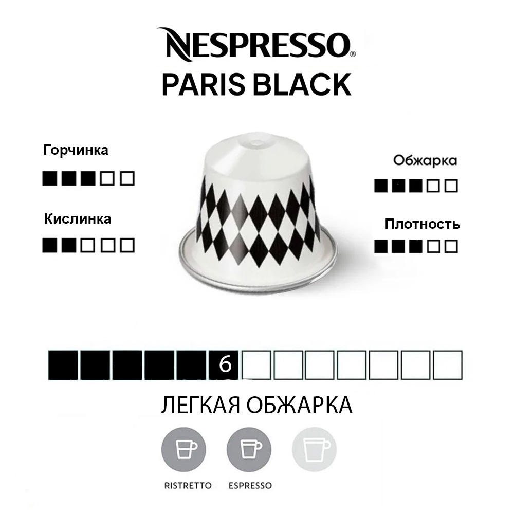 Кофе в капсулах Nespresso Paris Black Espresso — классическая разделенная обжарка, со средней интенсивностью и временем. Арабика и робуста обжариваются партиями (80/20). Часть робусты очень слегка обжарена, чтобы подчеркнуть нежные ноты арабики.