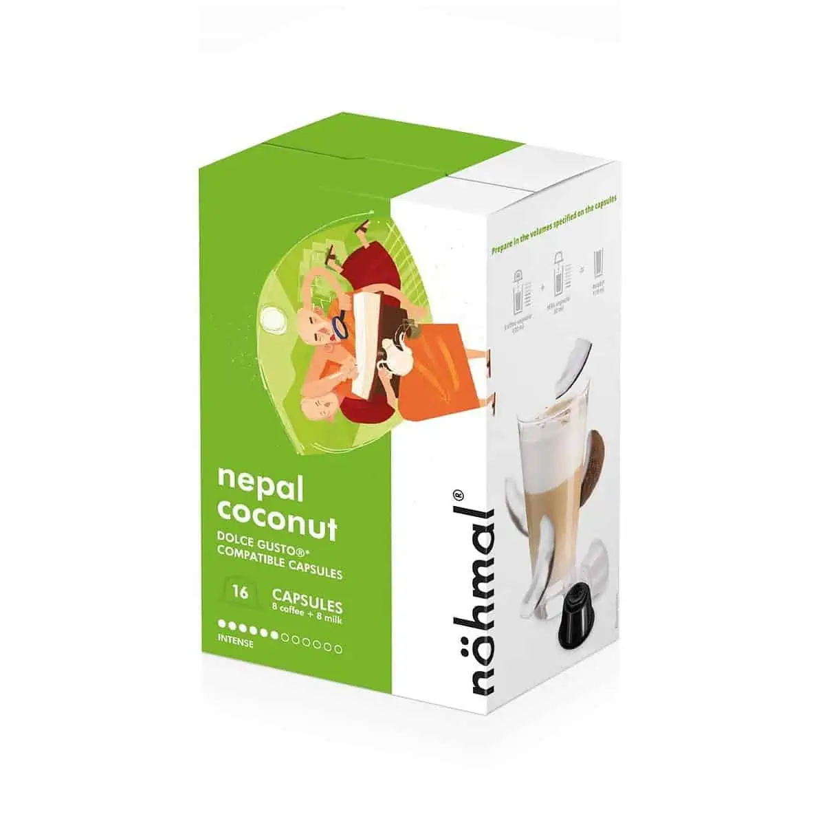Капсулы Nohmal Dolce Gusto Nepal Coconut — экзотический, завораживающий вкус с освежающими нотками сочного тропического кокоса из Непала, плавно переходящий в ароматное звучание свежеобжаренных зёрен кофе арабики в сочетании с нежнейшими сливками.