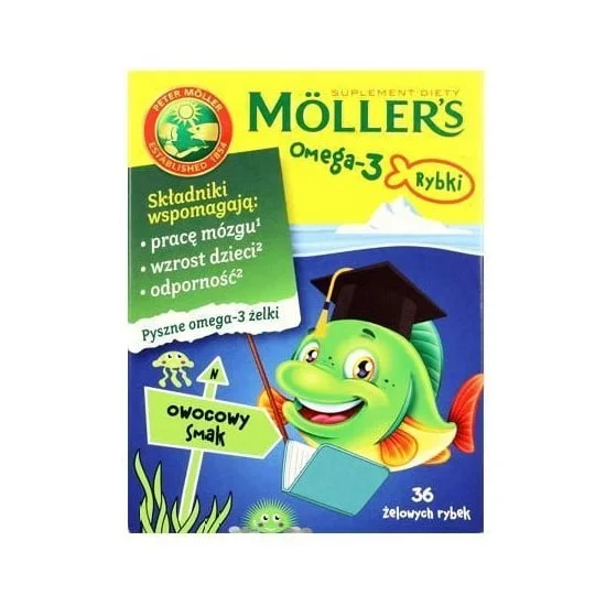 Mollers Omega-3 рыбий жир фруктовый — маленькие рыбки без добавления сахара, с подсластителями ксилитом и сорбитом. Омега-3 жирные кислоты, которые в изобилии в рыбьем жире, в частности, относятся к эйкозапентаеновым кислотам (EPA) и докозагексаеновым кислотам (DHA). Это полиненасыщенные жирные кислоты, которые способствуют формированию клеточных мембран (например, нервных клеток). Витамин D очень важен для детских костей для нормального роста и развития. Он также повышает функции иммунной системы.