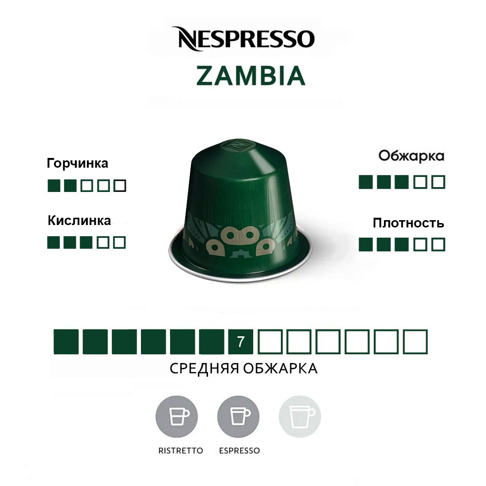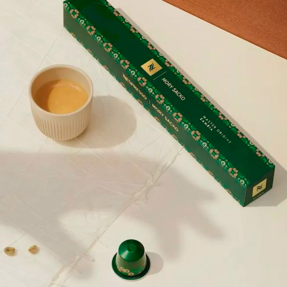 Капсулы Nespresso Original Zambia by Mory Sacko Limited Edition — это ограниченная серия, которая является частью коллекции Nespresso Master Origins. Замбия — земля недалеко от экватора, известная своим знаменитым водопадом Виктория, имеет все необходимое для производства исключительной арабики Altitude, источник пресной воды, образует ландшафт, в котором произрастает высококачественный сорт арабики. Nespresso и французский шеф-повар  Mory Sacko объединили свои таланты, чтобы создать этот эксклюзивный кофе. В коллекции представлены сорта кофе одного происхождения. Насыщенные ноты мацерованных ликеро-красных и экзотических фруктов в сочетании сладких ароматов и уникального сочетания зерновых и цветочных нот. Зерна получены с двух ферм, расположенных в красивой северной провинции Замбии. Обе фермы производят полностью мытый кофе, а процесс ферментации осуществляется исключительно на одной ферме.